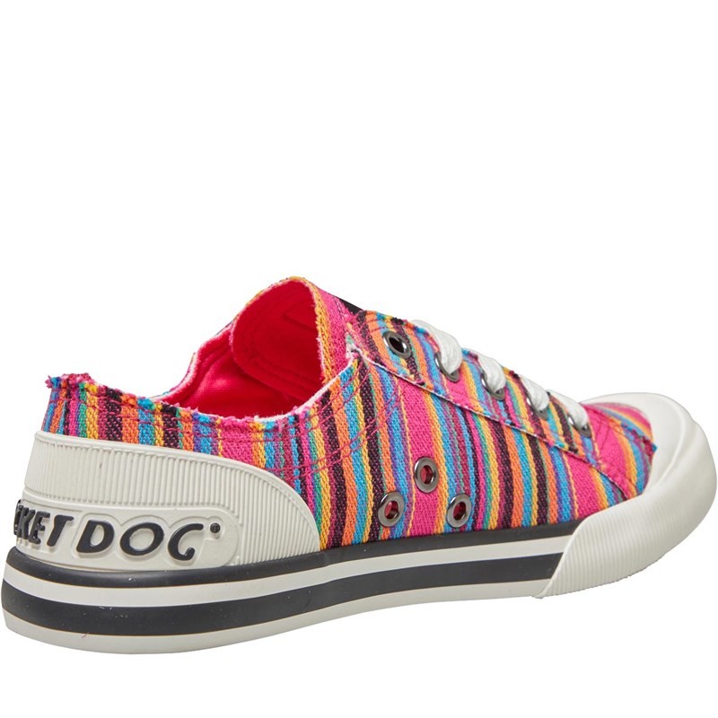 Rocket Dog low profile lace-up canvas pumps with rainbow striped upper and soft push foam footbed.